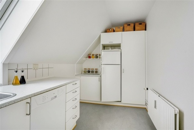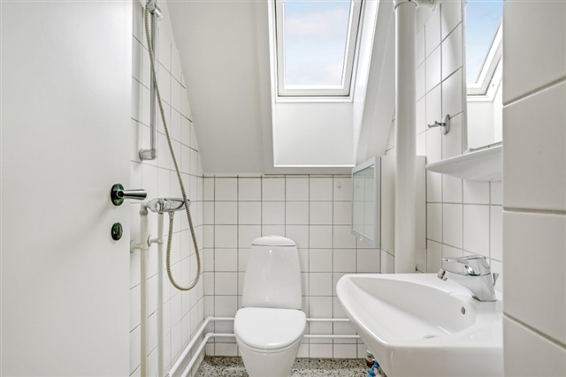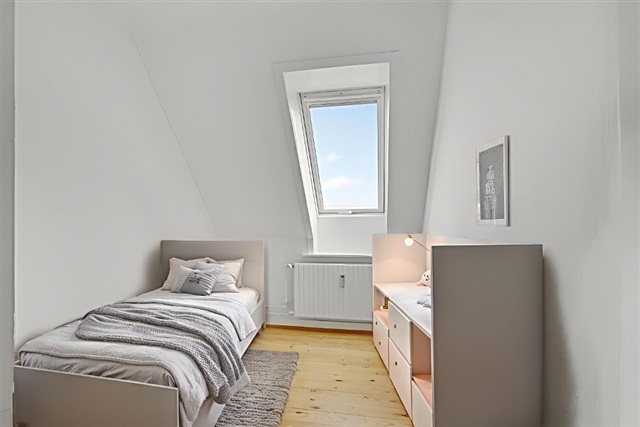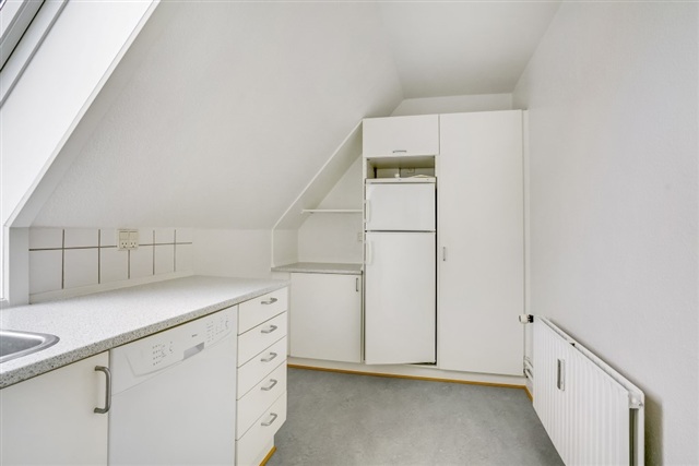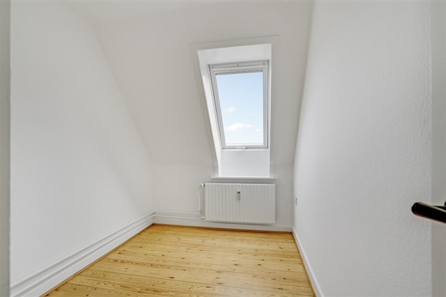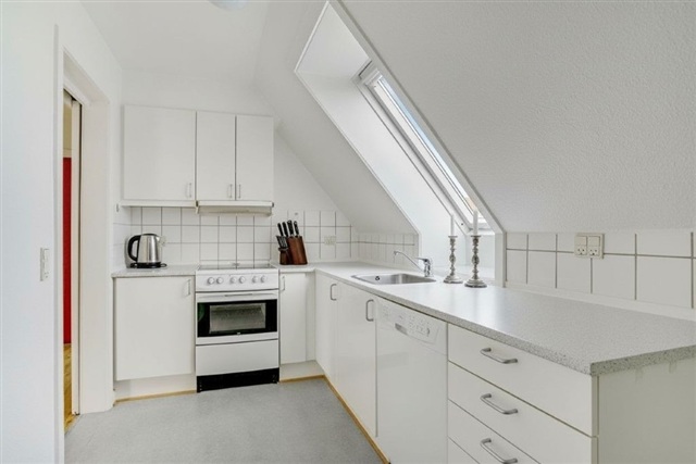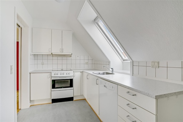 Denne 3-værelses lejlighed på 67 m² er beliggende øverst i bygningen og byder på et funktionelt og gennemlyst hjem med en gennemtænkt indretning. De store ovenlysvinduer og de karakteristiske skråvægge skaber et lyst og luftigt miljø, som præger hele boligen. Her tilbydes en praktisk bolig med separat køkken, en rummelig stue samt to værelser, hvilket gør den velegnet til par, den lille familie eller til dig, som ønsker et ekstra rum til kontor eller gæsteværelse.Fra entréen ledes du til et lyst og funktionelt køkken i vinkel med hvide elementer, hvor et ovenlysvindue tilfører naturligt dagslys. Køkkenområdet er udstyret med komfur, ovn og et kombineret køle-/fryseskab, og der er god bordplads samt klassiske fliser over arbejdsfladen. Gulvet i køkkenet er slidstærkt og praktisk til dagligt brug. Stuen, som udgør hjemmets samlingspunkt, har god plads til både sofa og spisebord, og det lysindfald fra de store vinduespartier samt ovenlys bidrager til en behagelig atmosfære, mens det lyse plankegulv tilfører varme og personlighed til rummet.