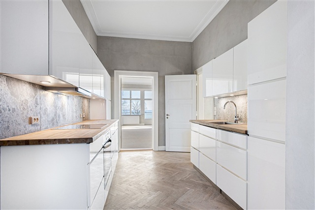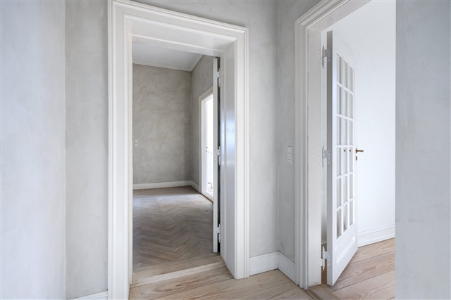 Indretningen åbner med en lys og imødekommende entré, som fører videre til to rummelige værelser. Det ene af dem har indbyggede skabe og kan let tilpasses til både soveværelse, kontor eller gæsteværelse alt efter behov. Hjertet i lejligheden er den store og imponerende opholdsstue, der prydes af smukke stuklofter og et rigt naturligt lysindfald. Herfra kan du nyde en uforstyrret udsigt over vandet mod Sverige, og fra stuen er der direkte udgang til en stor terrasse med enestående udsigt over havet. Terrassen er rummelig og har plads til både spisearrangementer og hyggelige opholdspladser, hvilket skaber et unikt udeareal, der forlænger boligens opholdsrum og egner sig til både hverdag og gæster.