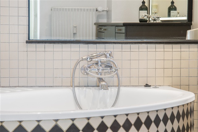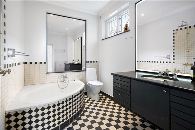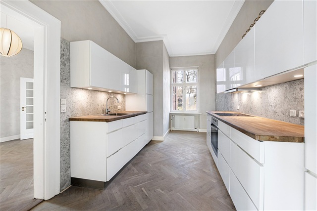 Køkkenet er praktisk og velindrettet, mens badeværelset fremstår lyst, stilrent og rummeligt. Helhedsindtrykket er en velfungerende planløsning, hvor traditionel herskabsstil møder moderne komfort.