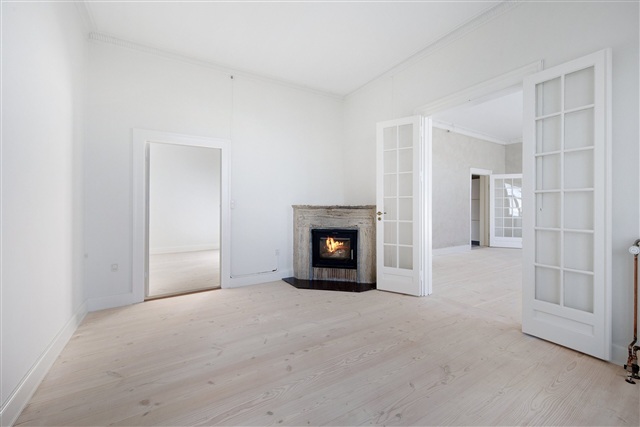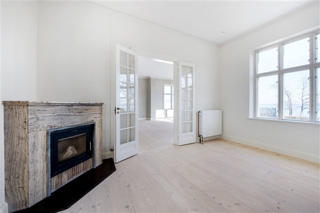 Fra opholdsstuen kan man via smukke franske døre komme ind i en yderligere stue, som rummer en original pejs med indsats. Også her bydes på flot udsyn til vandet, og rummet kan udnyttes som fjernsynsstue, ekstra soveværelse eller spisestue efter ønske og behov.