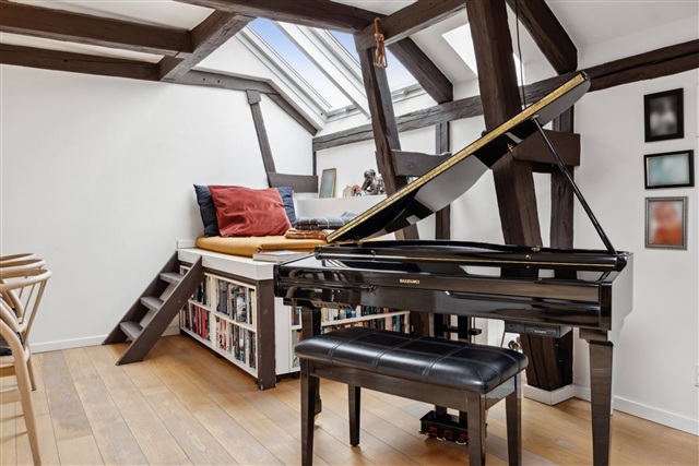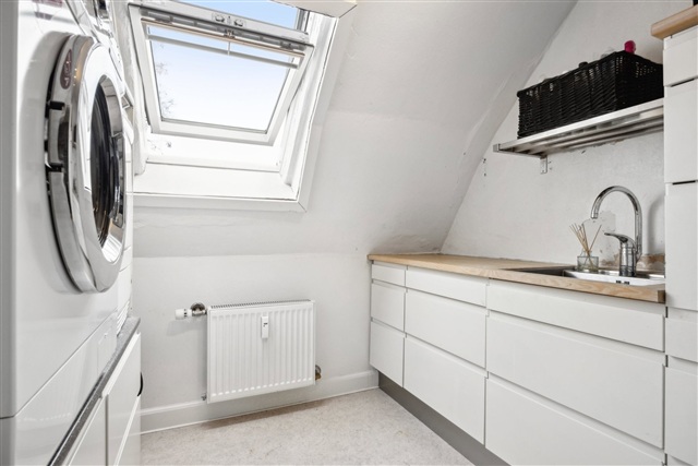 Ydermere findes et praktisk bryggers ved bagtrappen, udstyret med vaskemaskine og tørretumbler, hvilket gør dagligdagen enklere og mere funktionel. Denne rummelige taglejlighed kombinerer anderledes arkitektur med god brugbarhed og en eftertragtet beliggenhed.