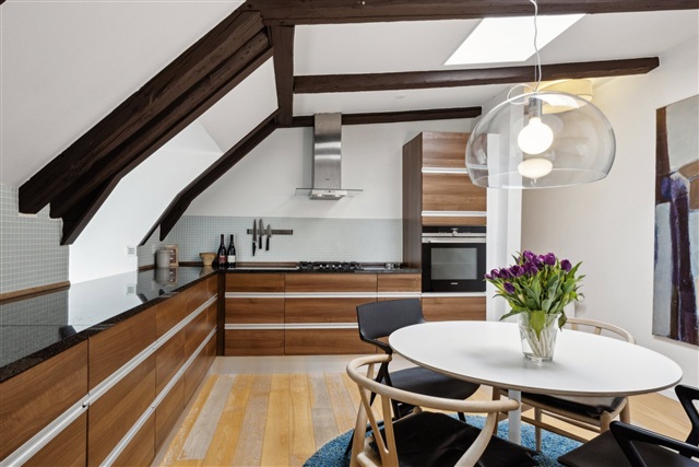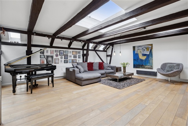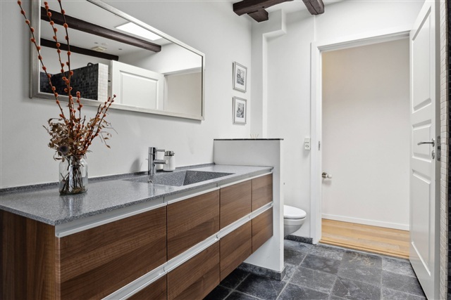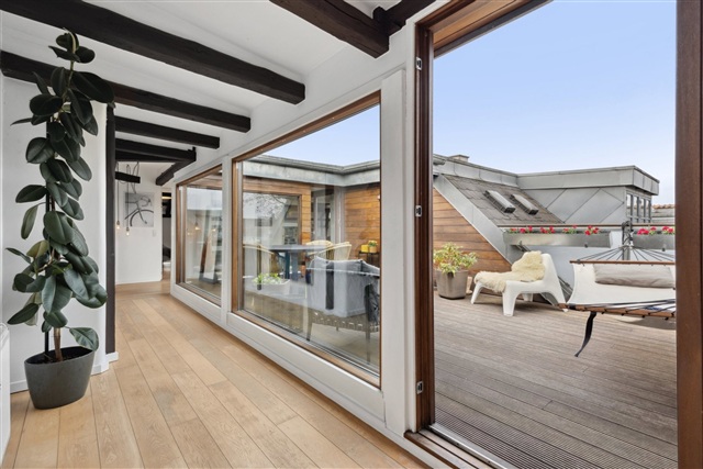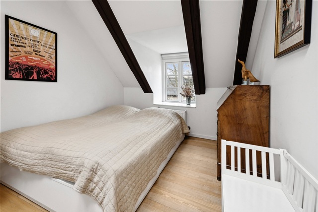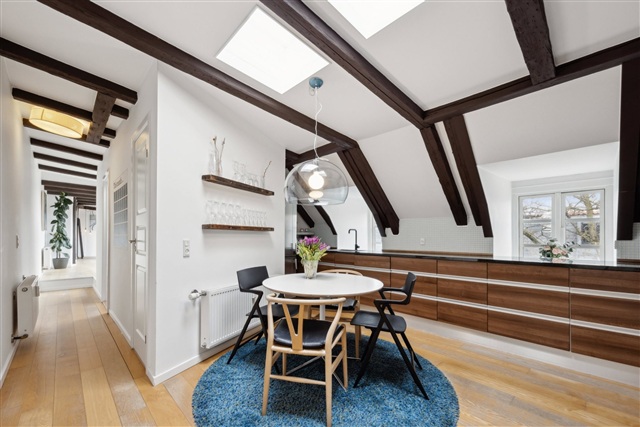 I øverste niveau af ejendommen på Åboulevard finder man denne særlige og rummelige taglejlighed, der tidligere udgjorde loftsrum og siden er omdannet til en moderne bolig med et areal på hele 188 m². Her opnår man en usædvanlig kombination af lys, plads og egen udendørs oase centralt i byen.Boligen byder på fire veludnyttede værelser og en gennemtænkt indretning, hvor flere ovenlysvinduer bidrager med et naturligt lys, som strømmer ind gennem dagen. De skrå lofter tilfører både charme og understreger den særlige karakter, der følger med at bo i en taglejlighed. Stuen er stor og fleksibel, og der er plads til både opholds- og spisemøbler. Køkkenet er adskilt og placeret i den modsatte del af lejligheden, hvilket skaber en klar opdeling, der sikrer ro og privatliv i begge områder.