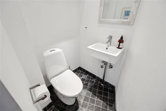 Badeværelset suppleres af et separat gæstetoilet, hvilket gør lejligheden velegnet for både par og familier, der har brug for ekstra plads. En af boligens mest bemærkelsesværdige egenskaber er den store private tagterrasse, som tilbyder en sjælden mulighed for udendørsliv i rolige og private rammer.