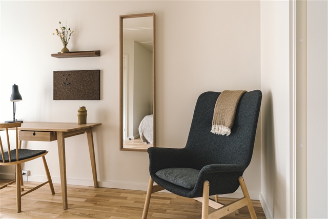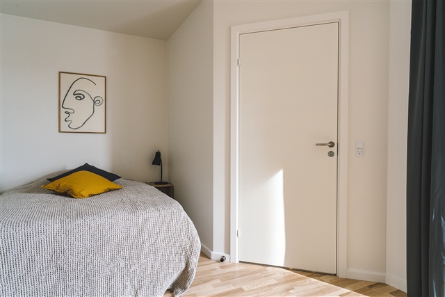 Lejligheden fremstår moderne og byder på flotte trægulve samt store, dobbelte glasvinduer, der sammen med centralvarme sikrer et behageligt indeklima. Boligen rummer fire soveværelser, et åbent køkken med plads til spisning samt en stue med TV. Der er et fælles badeværelse udstyret med vaskemaskine og tørretumbler, mens værelse nummer fire har sit eget private badeværelse. Fra stuen er der adgang til en fælles altan, og ejendommen har desuden en grøn baghave med borde og bænke til fælles benyttelse. Lige ned til vandet findes et selskabslokale, som udelukkende kan reserveres af beboerne til sociale arrangementer.Hvert værelse indeholder en seng af høj kvalitet med dyne, pude og sengetøj, et natbord med læselampe, et skrivebord med tilhørende stol og skrivebordslampe samt en lænestol. Desuden findes der garderobe med plads til at hænge tøj og skuffer, opbevaringskasser placeret under sengen, gardiner, spejl, vasketøjskurv, skraldespand, tæpper og pynteting.