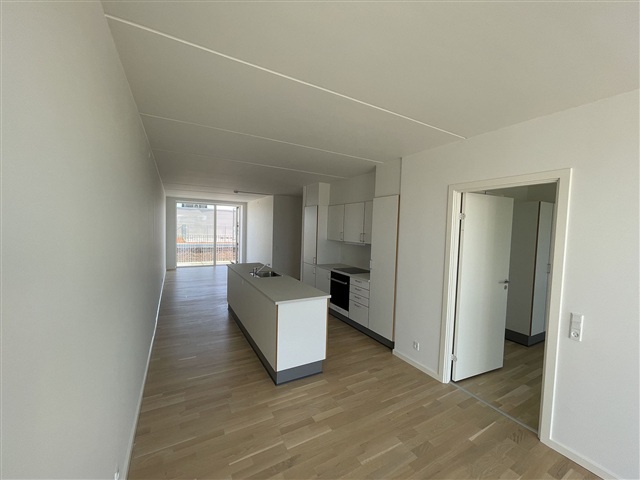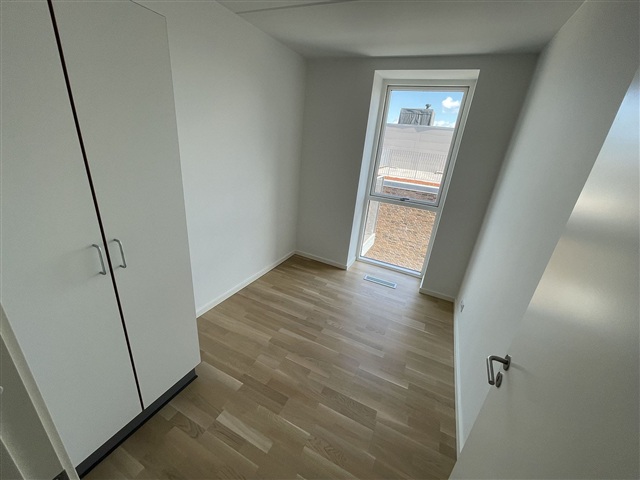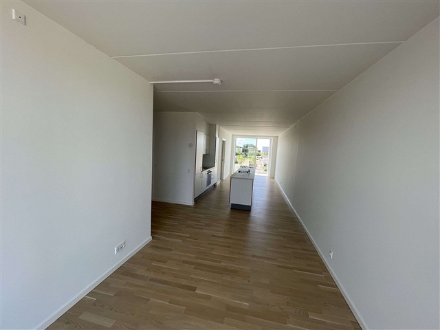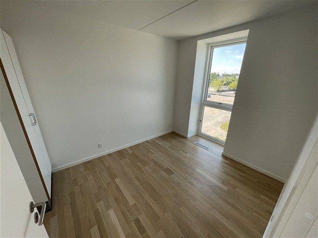 Ved ankomsten til lejligheden, som er beliggende på 4. sal, træder man ind i en bred gang, der rummer rigeligt med plads til opbevaring af både overtøj og sko. Langs den ene side af gangen ligger to værelser, mens badeværelset befinder sig på modsatte side. Videre indenfor folder et stort og åbent køkken-alrum sig ud i direkte forbindelse med stuen, der udgør det centrale opholdsområde. I hver ende af denne rummelige stue findes en balkon. Fra køkken-alrummet er der adgang til endnu et værelse, der har en god størrelse og egner sig til opbevaring. Samtlige boliger er desuden forsynet med moderne og tidssvarende hvidevarer.Boligen inkluderer desuden mulighed for parkering, ligesom der er tilknyttet et depotrum til hver lejlighed, hvilket øger både bekvemmelighed og plads til opbevaring.
