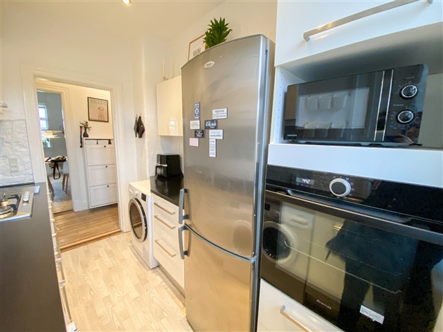 Denne indbydende lejlighed på 55 kvadratmeter, der er placeret på 4. sal, indeholder to rummelige værelser og et nyere køkken udstyret med stilrene hvide låger, som bidrager til et lyst og moderne udtryk. Boligens soveværelse er rummeligt og har plads til en stor seng samt et karnapvindue, der gør det muligt at indrette et lille arbejdsområde.Fra entréen er der adgang til et badeværelse med hvide klinker, en indbygget bruseniche og praktiske opbevaringsmuligheder. Den veldisponerede stue kan let indrettes med både spisebord og sofaområde uden at føles trang, og de sydvendte vinduer sikrer et godt lysindfald. Udover det naturlige lys giver boligens vinduer også en udsigt over Østre Anlæg, et af Aalborgs mest eftertragtede og grønne områder. Denne beliggenhed kombinerer roen fra naturen med nærhed til byens centrum og alle dets faciliteter såsom caféer, restauranter og butikker, som alle ligger inden for gåafstand.