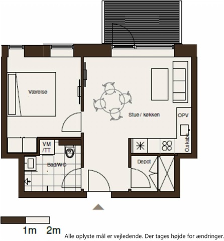 Lejlighedens værelse befinder sig i forlængelse af stuen og rummer indbyggede skabe samt plads til både seng og et skrivebord. Derudover er der fra entréen adgang til et depotrum, der kan benyttes til opbevaring, som et walk-in-closet eller en kombination af begge dele.