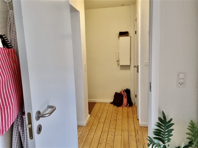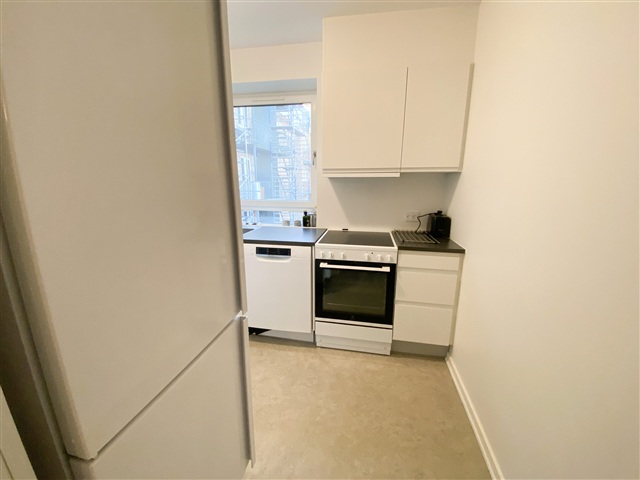 Ved indgang til denne lejlighed træder man først ind i en mindre entré, som videre fører til badeværelset. Badeværelset er frisk renoveret og byder på en separat, indbygget bruseniche. Rummet fremstår lyst og indbydende takket være de hvide klinker, der præger overfladerne.Fra entréen kommer man videre til køkkenområdet, hvor et ekstra bord er sat op for at øge arbejdsfladen markant. Udover funktionaliteten kan man nyde udsigten til en stor, grøn gårdhave gennem køkkenets vindue. Lige forbi gangen ligger soveværelset, der imponerer med sin rummelighed. Her vil selv en standard dobbeltseng virke kompakt, og der er plads til et stort klædeskab, hvilket åbner op for mange indretningsmuligheder.