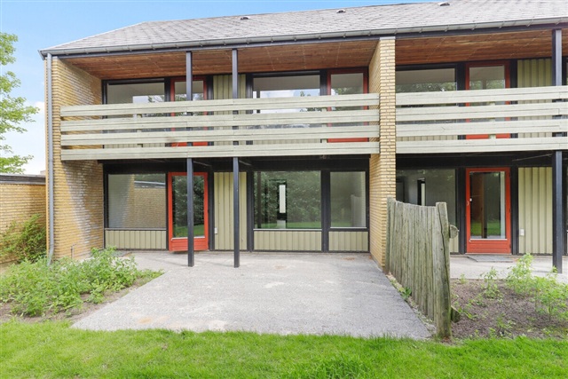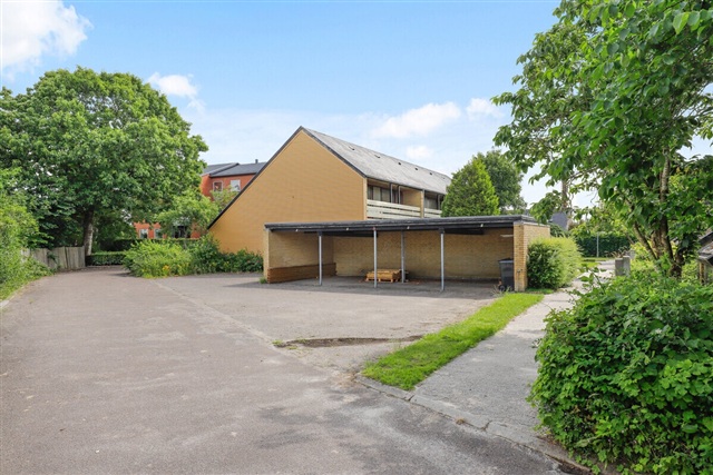 Udenfor tilbydes en skøn terrasse, hvor det er muligt at anlægge en køkkenhave. Desuden er der et stort skur samt cykelparkering foran boligen. Hvert lejemål hører desuden til en carport. Til fælles benyttelse findes tørrestativ samt et område, der inviterer til samvær med naboerne.