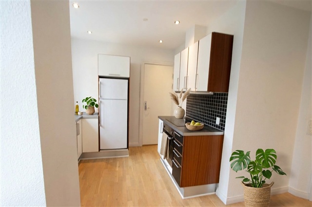 Lejligheden henvender sig særligt til singler, par eller venner, som ønsker at bo sammen og dele boligen.Køkkenet, som er af nyere dato, fungerer som hjemmets centrale samlingspunkt. Her findes en opvaskemaskine, et rummeligt køle-fryseskab og god plads til opbevaring af diverse køkkenredskaber. Badeværelset, der fremstår lyst, indeholder en separat bruseniche, praktiske opbevaringsmuligheder under vasken samt LED-belysning integreret i spejlet.