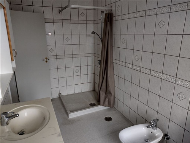Stort lyst sydvendt køkken med alle hvidevarer, og stort samtalebadeværelse med badeværelsesarrangement (2 håndvaske, bidet og brusekabine).
