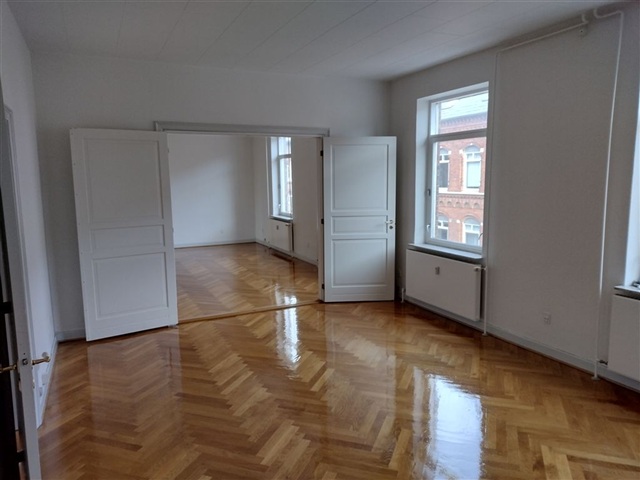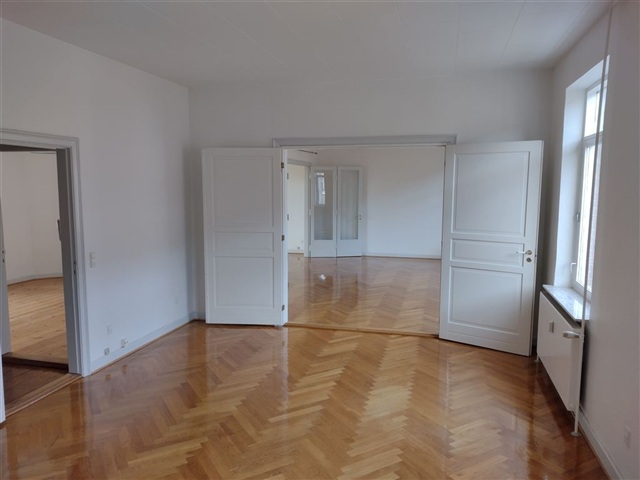 Rummelig nyistandsat herskabslejlighed med 5 værelser ledig straks.3 stuer med egetræsparket.