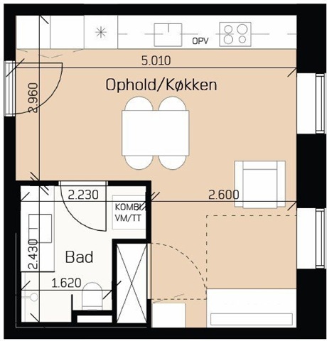 Denne attraktive 1-værelses lejlighed på 40 m² kombinerer funktionalitet med moderne komfort i et lyst og rummeligt miljø. Boligens gennemtænkte indretning samler stue og køkken i et åbent rum, hvor de to områder glider sammen og skaber en behagelig atmosfære til dagligdagen.Bemærk, at de viste billeder ikke stammer fra denne specifikke bolig, men plantegningen repræsenterer boligens indretning nøjagtigt.
