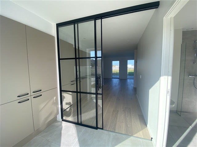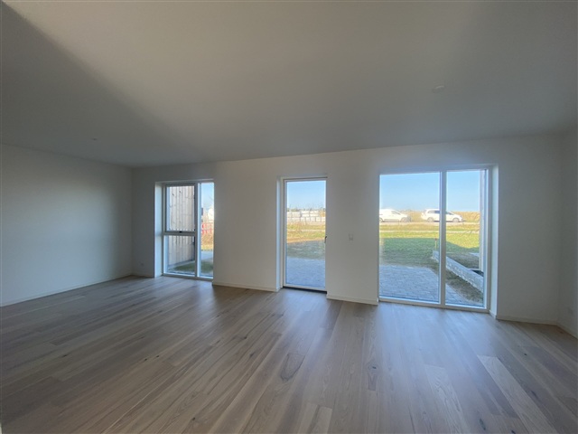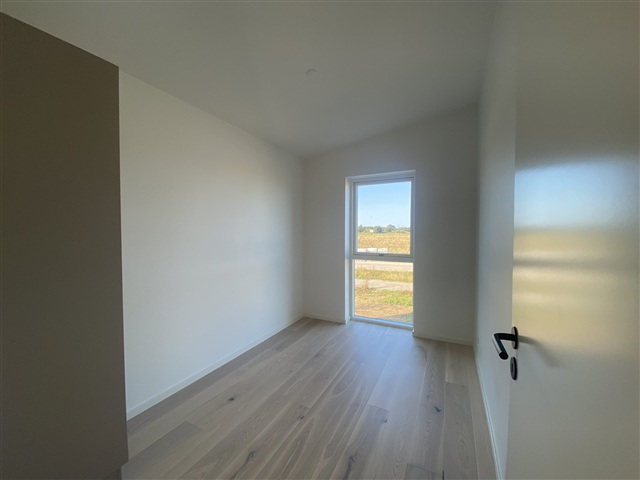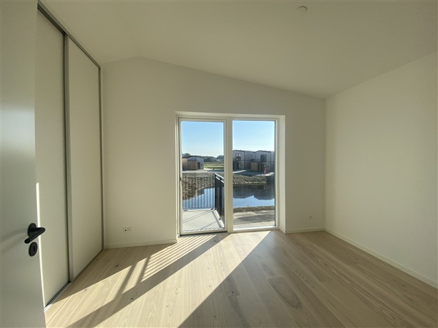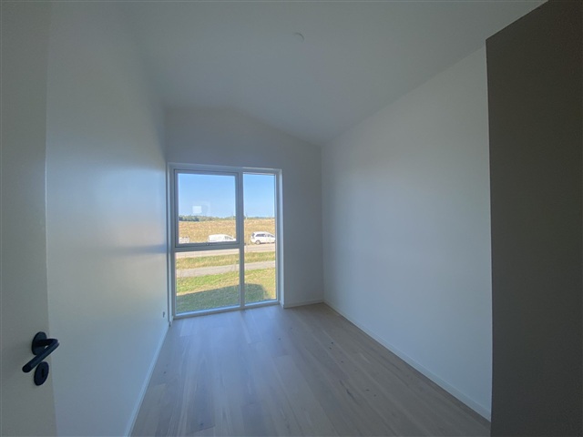 De 114 m² fordeles på tre soveværelser samt en stor, åben køkken- og opholdsstue, der giver plads til både spise- og siddeafdeling. Der er to badeværelser samt en dejlig altan, der tilknyttes ét af værelserne. Dertil kommer egen terrasse og have, skur samt en parkeringsplads.