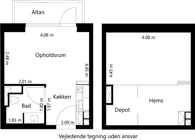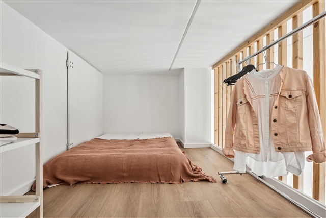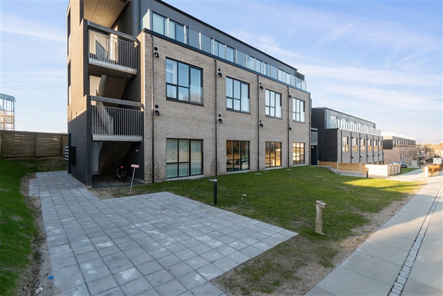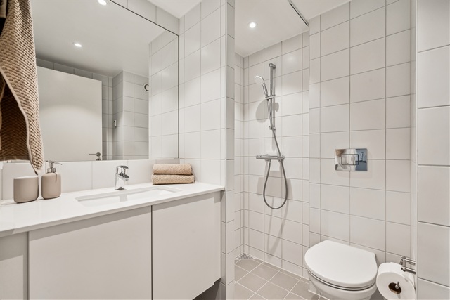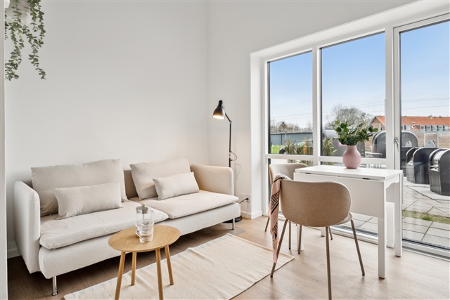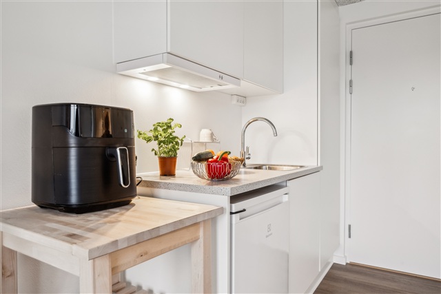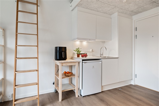 Denne lejlighed med ét værelse er placeret på førstesalen og rummer et selvstændigt tekøkken udstyret med en kogeplade med to zoner, køleskab med frysefunktion samt en emhætte. Boligen kendetegnes ved sin store loftshøjde, en charmerende hems og en rummelig altan, der vendes mod solen. Desuden er der et privat badeværelse, som indeholder en separat bruseniche samt toilet.Ejendommen byder på flere fællesfaciliteter både inde og ude. Indendørs findes tre større fællesrum, som primært anvendes som vaskeri med vaskemaskiner og tørretumblere, mens enkelte borde og stole står til rådighed for ophold i ventetiden. Udenfor kan beboerne benytte grønne områder samt en basketballbane, hvor der er mulighed for at spille med naboerne. Parkeringspladser kan lejes, og cykler kan opbevares i et aflåst cykelskur, der er tilgængeligt for beboerne.