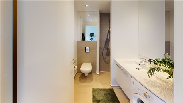 Indretningen følger et lyst og nordisk udtryk med egeparketgulve, som bidrager til en naturlig og indbydende atmosfære. Store vinduespartier sikrer et godt lysindfald, mens ventilation og varmegenvinding sørger for et sundt og behageligt indeklima. Køkken og bad er stilfuldt designet med elementer fra Invita, mens Siemens leverer de hårde hvidevarer. Badeværelset har gulvvarme og klinker, der er nemme at vedligeholde, og det indeholder toilet, håndvask, bruseniche samt en kombivaskemaskine.