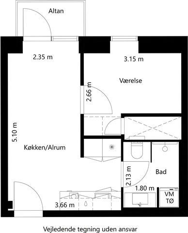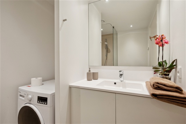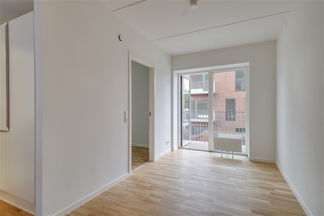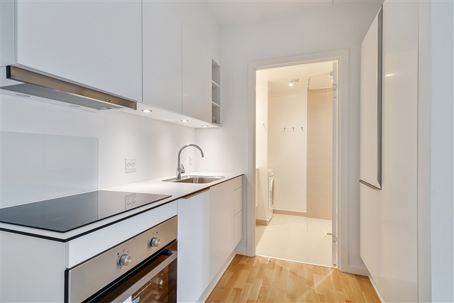 Denne 2-værelses lejlighed byder på en privat altan, der ligger i direkte forbindelse med et lyst og åbent køkkenalrum. Køkkenet fremstår moderne og er udstyret med køle/fryseskab, indbygget ovn, kogeplade, emhætte samt opvaskemaskine. Det tilhørende værelse er rummeligt og har hvide skabe til opbevaring. Badeværelset er veludstyret med en bruseniche og vaskemaskine.Lejligheden disponerer desuden over et separat depotrum. Mulighed for leje af parkeringsplads findes i ejendommens parkeringskælder, og der er aflåst cykelparkering tilknyttet ejendommen. De grønne fællesarealer skaber et behageligt udeområde for beboerne.