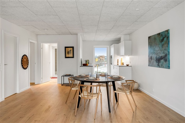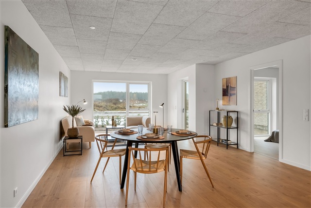 I det eftertragtede område omkring Billund findes der 44 lejligheder, fordelt på 2 til 5 værelser, som er kendetegnet ved deres lyse og moderne udtryk. Boligerne er opført med særlig vægt på funktionalitet, godt lysindfald og materialer af høj kvalitet. Hver enkelt bolig fordeler sig over to etager med en vandret adskillelse, således at den ene lejlighed ligger i stueplan, mens den anden befinder sig på første sal. Alle lejligheder har enten adgang til en privat terrasse med tilhørende have, hvis man bor i stueplan, eller alternativt en stor tagterrasse, hvis man bor på første sal.Dette rækkehus byder blandt andet på en nutidig bolig klassificeret i energiklasse A2015, som er designet med gennemtænkte rumløsninger og rigelig opbevaringsplads. Samtlige rum er udstyret med gulvvarme, og der er individuelle termostater, der kan justeres for hvert rum. Der er installeret et ventilationssystem, der sikrer en sund og komfortabel luftkvalitet indendørs. Køkkenet er stilrent og grebsfrit fra Tvis, og inkluderer desuden alle nødvendige hårde hvidevarer. Gulvene har et look som egetræ, hvilket skaber varme og karakter i hjemmet. Yderligere får man enten en privat terrasse eller altan, samt en parkeringsplads placeret tæt ved boligen. Som beboer har man desuden adgang til et grønt, fælles område med legeplads, stisystemer og hyggelige steder til ophold.