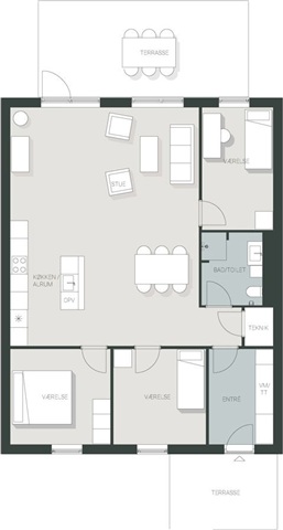 Husets centrale område består af et rummeligt køkken-alrum, der åbner op mod stuen, hvilket skaber et naturligt samlingspunkt for hele familien. Det åbne køkken giver rum til madlavning, spisebordet fungerer som et sted til lektier, og stuen tilbyder et afslappende hjørne - alt sammen i ét sammenhængende rum, hvor I kan være sammen og dele dagens oplevelser. Fra dette område er der adgang til boligens øvrige værelser.