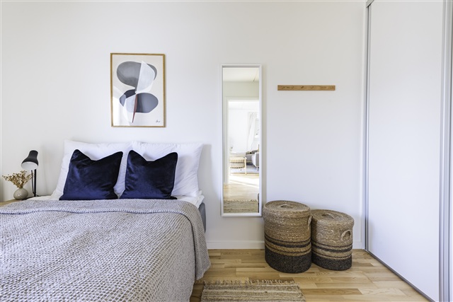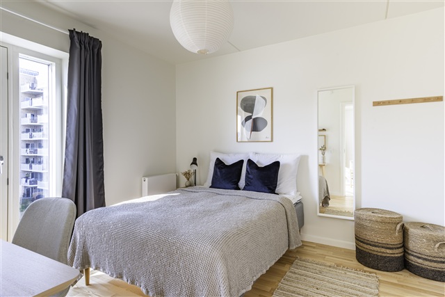 Denne moderne lejlighed er udstyret med smukke trægulve samt store dobbeltruder, og varmeforsyningen sker via centralvarme. Boligen består af fire værelser, et åbent køkken med spiseplads samt en opholdsstue med tv. Der findes ét fælles badeværelse, som er udstyret med både vaskemaskine og tørretumbler. Det fjerde værelse har desuden sit eget private badeværelse. Fra køkken og stue er der udgang til to altaner; en stor og en mellemstor, begge med en fremragende udsigt.Ejendommen har en grøn baggård med borde og bænke, og blot 50 meter herfra, ved vandkanten, ligger et selskabslokale, som udelukkende kan lejes af beboerne i ejendommen til sociale arrangementer.