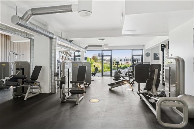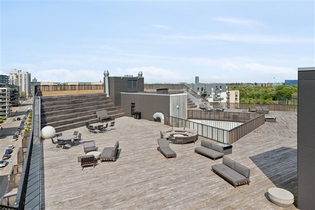 Soveværelset er rummeligt og fredeligt placeret, med plads til både seng og opbevaringsløsninger. Badeværelset fremstår indbydende og moderne med eksklusive materialevalg, en separat bruseniche samt en vaskesøjle, der tilsammen sikrer en høj daglig komfort. Som lejer får man adgang til flere attraktive fællesfaciliteter, herunder en privat fitnessafdeling i ejendommen samt en stor fælles tagterrasse med en enestående udsigt over byens skyline, havneløbet og byens puls. Denne tagterrasse giver gode muligheder for afslapning, solbadning og hyggelige stunder sammen med venner og familie.