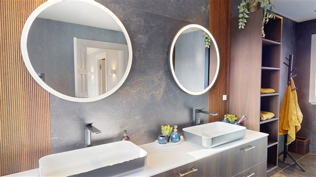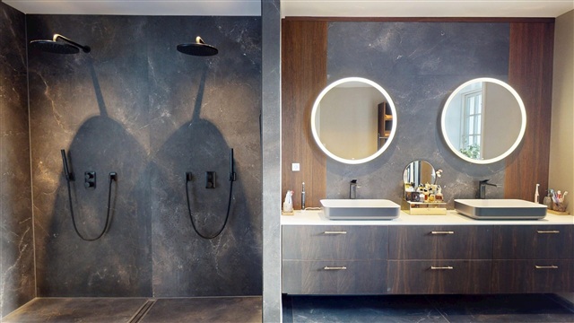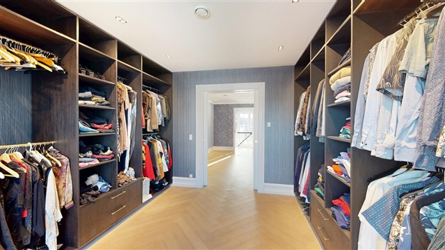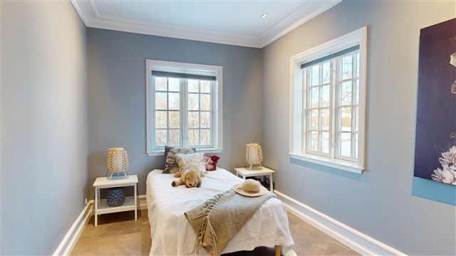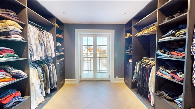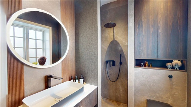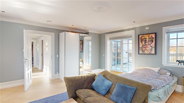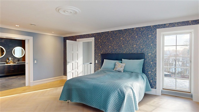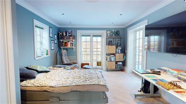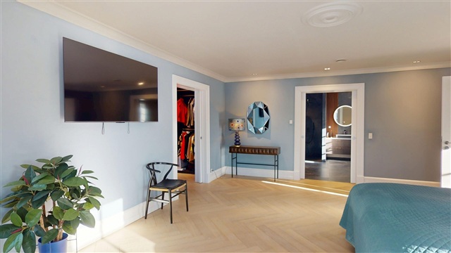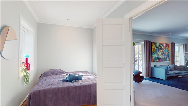 Hjemmet råder over fem velproportionerede værelser, der alle bærer præg af samme høje finish som resten af boligen. Især masterafdelingen skiller sig ud som en privat oase med eget walk-in-closet, et luksuriøst badeværelse med dobbelte brusenicher og håndvaske samt adgang til to separate, private tagterrasser. Badeværelsernes design er konsekvent og stilrent med Alape-håndvaske og spejle, hvilket går igen i samtlige tre badeværelser og skaber en smuk, gennemgående æstetik.
