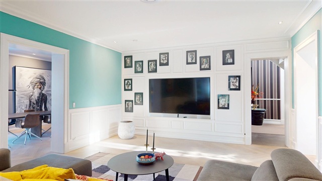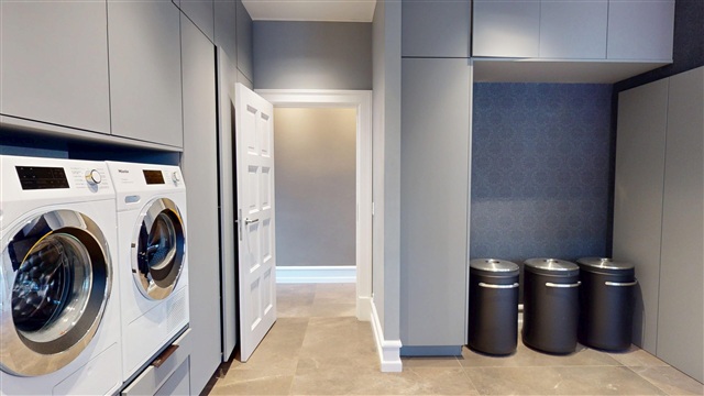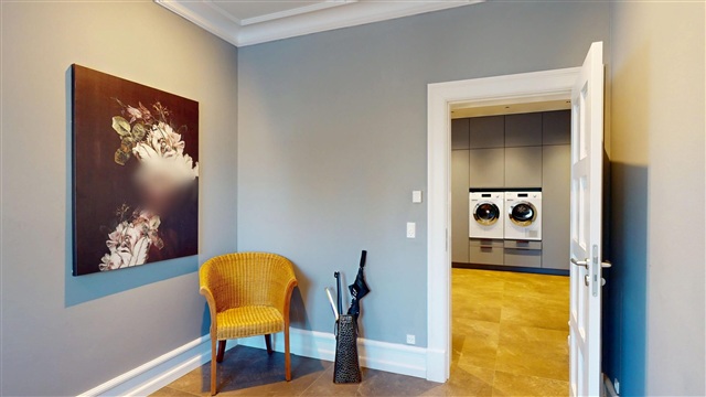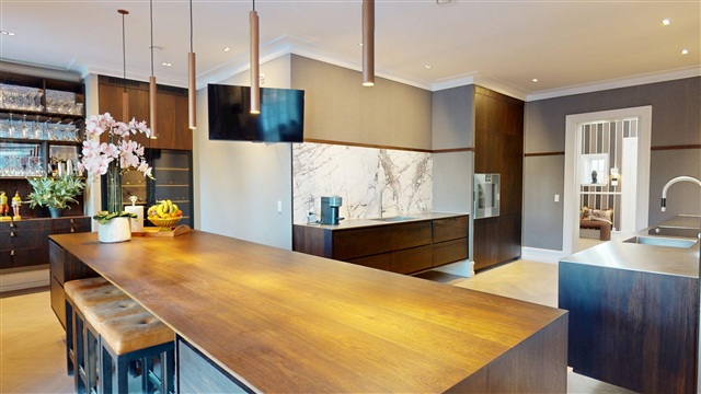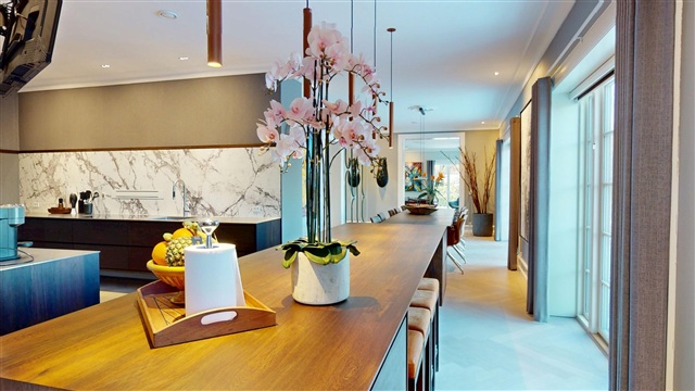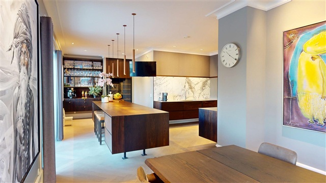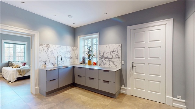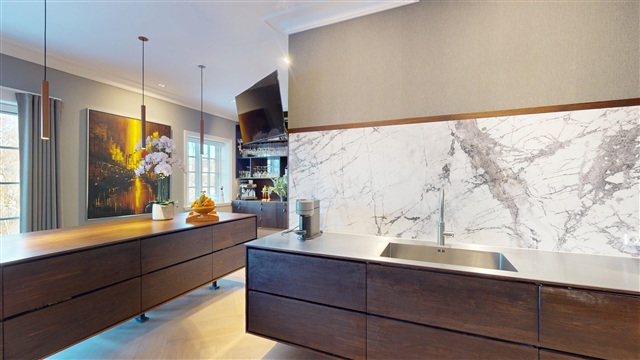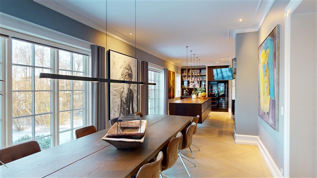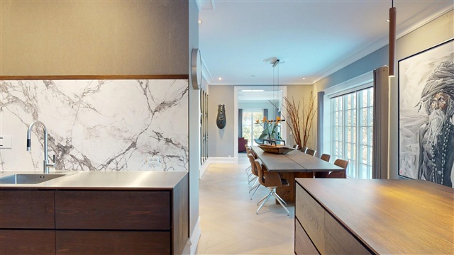Boligens hjerte er køkken-alrummet, hvor et solidt, håndlavet snedkerkøkken i massiv eg træder frem som et stilfuldt omdrejningspunkt. Her inviterer den rummelige køkkenø til både madlavning og uformelle samvær, mens et særskilt cocktailområde understreger den sociale funktion. Gaggenau-apparater og armaturer fra Dornbracht vidner om nøje udvalgte, eksklusive materialer, og det massive Whalebone-plankegulv i sildebensmønster fra Hørning tilfører rummet en varm, tung og klassisk elegance under fødderne.