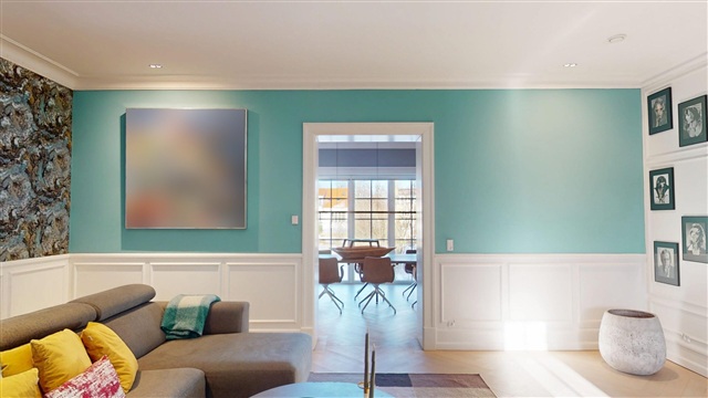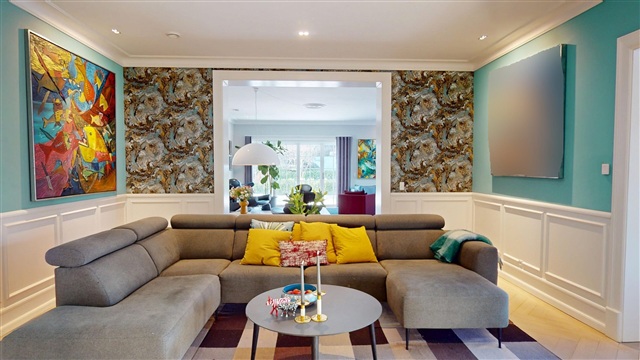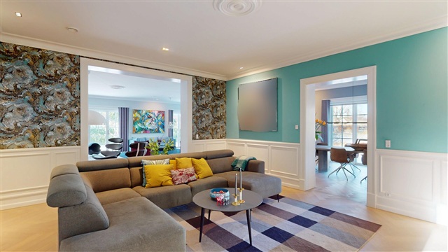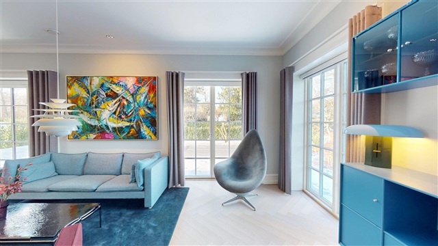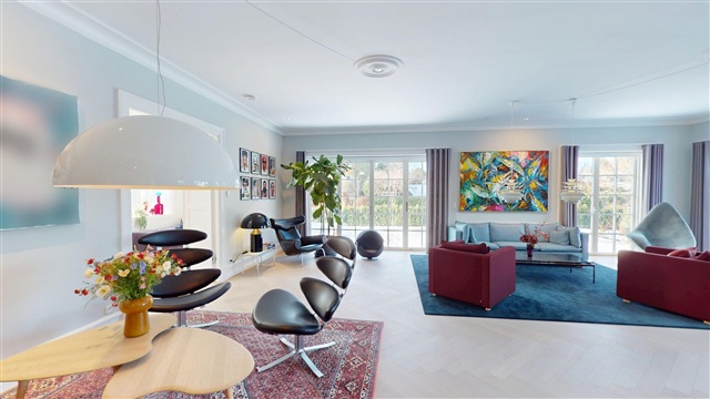 I direkte forlængelse af køkken-alrummet breder boligens to store stuer sig ud med lysindfald fra flere vinkler, hvilket skaber en generøs rumfornemmelse og etablerer en naturlig forbindelse til haven. Disse vidtstrakte opholdsrum egner sig både til repræsentative arrangementer og rolige stunder med frit udsyn til de grønne omgivelser og den fredfyldte sø.