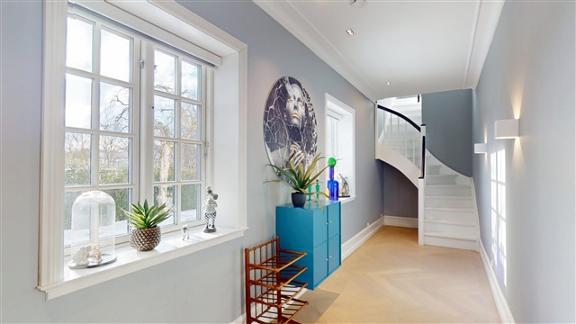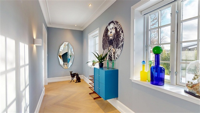 Ejendommen gennemgik en total renovering i 2022 og fremstår i dag i en kvalitet, der rækker til de højeste standarder. Opvarmningen sker ved hjælp af jordvarme, som er særligt energibesparende, og sammen med gulvvarme installeret i alle boligens rum samt et moderne ventilationssystem sikres et behageligt og sundt indeklima året rundt kombineret med et minimalt energiforbrug - netop som man forventer i en moderne liebhaverbolig.Fra ankomst til adressen fornemmes med det samme den unikke stemning, der præger området. Vejen deler en fælles adgang til en lille, naturskøn sø, som bidrager med en sjælden ro og en eksklusiv atmosfære, samtidig med at den spejler årstidernes skiften og himlen på smukkeste vis. Med sin private og fredelige placering blander ejendommen elegance med en følelse af at være afskærmet fra hverdagens travlhed, samtidig med at der ikke er langt til byens faciliteter, skoler og den omkringliggende natur.