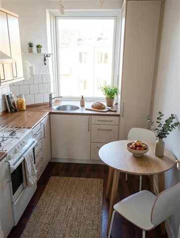 Denne lejlighed udstråler både charme og en lys atmosfære, og den står klar til indflytning med en behagelig stemning. Med sine 51 kvadratmeter fremstår boligen veldisponeret og inviterende gennem det naturlige lys, der strømmer ind.Den lyse stue har store vinduespartier samt en vinduesdør, som åbner ud til en fransk altan, hvilket bidrager til et åbent og luftigt miljø. Boligens enkle planløsning omfatter et separat soveværelse, der er rummeligt nok til både dobbeltseng og garderobe, og stuen kan uden besvær anvendes som et ekstra værelse. De hvide vægge suppleret med lyse plankegulve giver rummet en varm og indbydende karakter. Køkkenet er praktisk indrettet med gode arbejdsområder og et stort vindue, som lader naturligt dagslys slippe til. Der er desuden plads til et lille cafébord, hvor morgenkaffen kan nydes i hyggelige rammer. Badeværelset er udført i klassisk stil med hvide fliser, komplet med bruser, toilet og håndvask, hvilket sikrer nem vedligeholdelse.