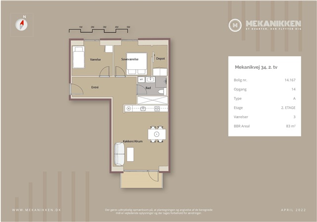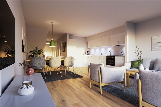 De tilgængelige lejligheder varierer i størrelse fra 61 til 121 kvadratmeter og indeholder mellem 2 og 4 værelser. De er designet med moderne indretninger, hvor planløsningerne er fleksible, og køkkenet er integreret med alrum i åbne opholdsarealer. Desuden er depotrum, typisk placeret adskilt fra soveværelset, inkluderet med henblik på at optimere funktionaliteten, maksimere dagslyset og skabe en hjemlig atmosfære. Boligerne er kendetegnet ved en høj standard; blandt andet er der egetræslameller og gulvvarme i samtlige rum. Køkkenerne er fra HTH og er udstyret med Corian-bordplader samt fuld udstyrspakke bestående af opvaskemaskine, vaskemaskine og tørretumbler.Hver bolig råder over enten en privat altan eller adgang til fælles faciliteter såsom en tagterrasse og grønne gårdmiljøer. Store vinduespartier i både opholdsrum og værelser sikrer et rigt indfald af dagslys. Flere af lejlighederne har endvidere facade ud til både gade og gård, hvilket bidrager til optimal lysindfald i løbet af dagen. Det skal bemærkes, at de viste billeder til lejemålet udelukkende er visualiseringer eller stammer fra en prøvebolig, og derfor afspejler de ikke nødvendigvis den konkrete bolig.