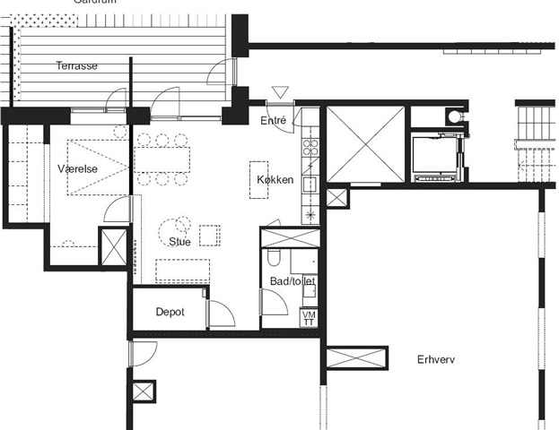 Stor 2-værelses lejlighed med terrasse