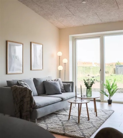 Dette charmerende treværelses rækkehus er indrettet med en gennemtænkt planløsning. Bemærk venligst, at alle billeder, plantegninger og visualiseringer kun tjener som vejledning. Boligen er spejlvendt i forhold til den viste plantegning.Køkkenet ligger i denne bolig i en vinkel langs væggen, hvilket giver mulighed for både spiseplads og en behagelig sofaopsætning i stuen. De lyse materialer kombineret med moderne hårde hvidevarer bidrager til et funktionelt og lyst køkkenmiljø. Fra stuen er der direkte adgang til terrassen, som skaber gode rammer for udeliv. Boligens to værelser består af et soveværelse samt et ekstra værelse, der kan anvendes efter behov - eksempelvis som børneværelse, kontor eller gæsterum. Soveværelset har tre indbyggede skabe og plads til dobbeltseng samt tilhørende møbler. Badeværelset er centralt placeret og udstyret med bruseniche, toilet og håndvask, hvor materialerne harmonerer med det resterende interiør.