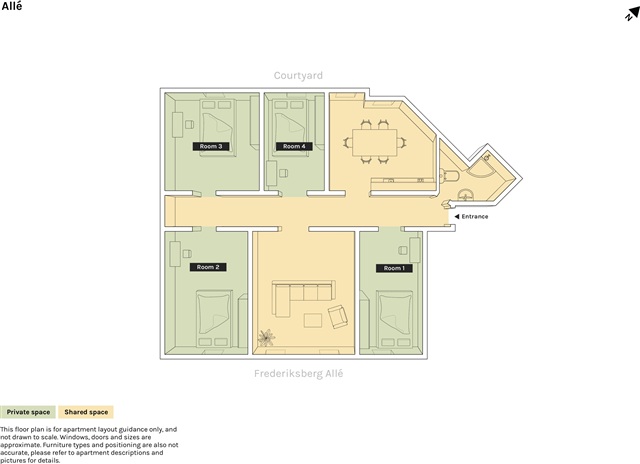 Denne lejlighed ligger i Frederiksberg, som er en selvstændig kommune adskilt fra København, men stadig i det samme geografiske område. Boligen befinder sig i stueetagen i en smukt istandsat ældre ejendom, som stammer tilbage til 1872. Gaden, hvor lejligheden er placeret, har en rig historie, idet den kan føres tilbage til 1700-tallet. Oprindeligt fungerede den som kongens private vej til hans nye sommerbolig, Frederiksberg Slot. I dag er gaden kendt som en central rute ved større events såsom prideoptog, cykelløb, halvmaraton og royale begivenheder.Lejlighedens planløsning er kompakt, men meget indbydende og skaber en hjemlig atmosfære. Køkkenet er rummeligt og har desuden et forhøjet spisebord, som kan rumme omkring 7-8 personer. Den store stue giver god plads til at være mange og egner sig godt til samlinger med flere gæster. Her er en stor tv-skærm, som gør det oplagt at holde film-aftener og slappe stunder derhjemme. Værelserne varierer i størrelse; to af dem vender ud mod gaden, mens de resterende to har udsigt til baggården. Adgang til baggården er muligt direkte fra lejligheden. Yderligere hører der også en kælder til, hvor hver beboer har tildelt et mindre opbevaringsrum til eget brug.