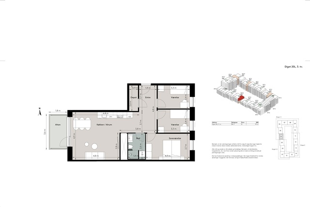 Det arkitektoniske udtryk består af en klassisk karrestruktur med lejligheder fra 1 til 5 værelser, suppleret af et markant hjørnehus, som rummer både parkering og 2-værelses boliger. Ovenpå hjørnehuset ligger et fælles gårdmiljø, der skaber grønne og sociale opholdsrum. I stueetagen placeres COOP 365, forskellige specialbutikker samt restauranter, som tilsammen bidrager til et levende butikstorv med dagligdags bekvemmeligheder. Boligerne på de øvre etager drager fordel af store vinduespartier, der sikrer et godt lysindfald og flot udsigt.