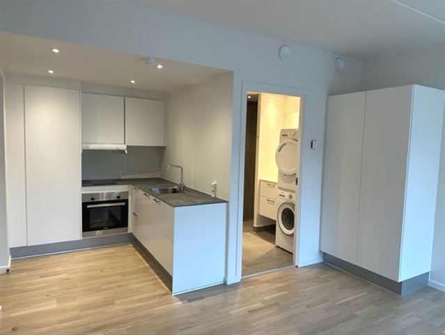 Lejligheden byder på et lyst og indbydende køkkenalrum med tilhørende stue og værelse, hvor en karnap tilfører ekstra lys og charme. Derudover råder boligen over et rummeligt og flot badeværelse. Hårde hvidevarer inkluderer både vaskemaskine og tørretumbler, hvilket gør hverdagen mere bekvem. Gulvvarmen er termostatstyret og føres gennem samtlige rum, hvilket sikrer en behagelig temperatur hele året rundt.Ved boligindgangen findes et mindre, aflåst opholdsområde i en stille gårdhave, som egner sig godt til at nyde en kop kaffe i solskinnet. Ejendommen er velholdt og har en fast viceværtordning samt elevator, der bidrager til en praktisk og overskuelig hverdag.