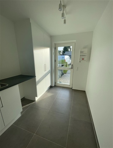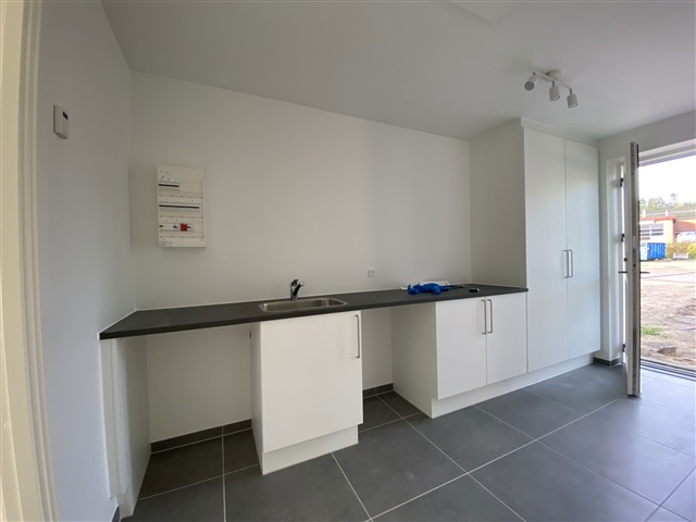 Materialevalget i huset er gennemført med et bryggers, der er forsynet med faste skabe og arbejdsbord fra HTH, samt plads til vaskemaskine og tørretumbler. Der er desuden et lukket teknikskab og en loftlem, der giver adgang til husets loftsrum. Badeværelset indeholder en fast HTH-badmiljøløsning med håndvask og spejl, et Ifö-toilet, kvalitetsarmaturer fra tyske Hans Grohe, og en designafløbsrende placeret i brusenichen.