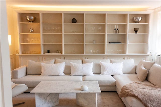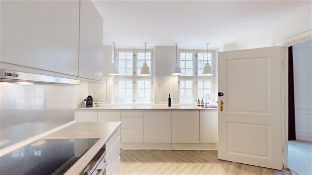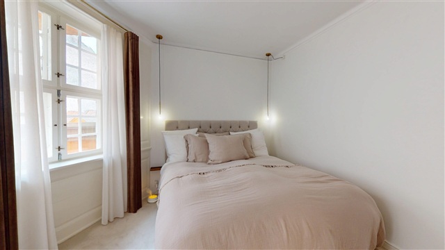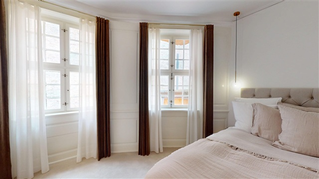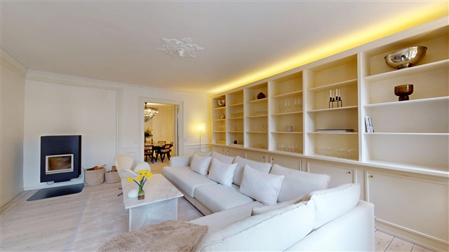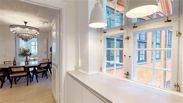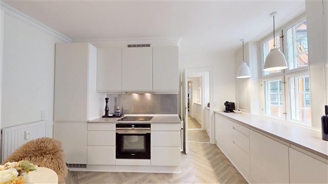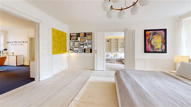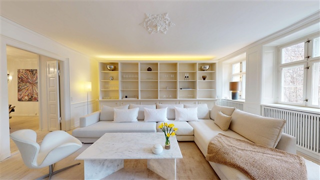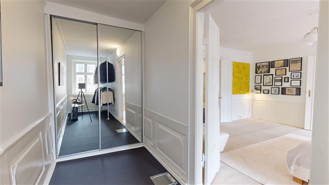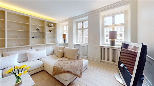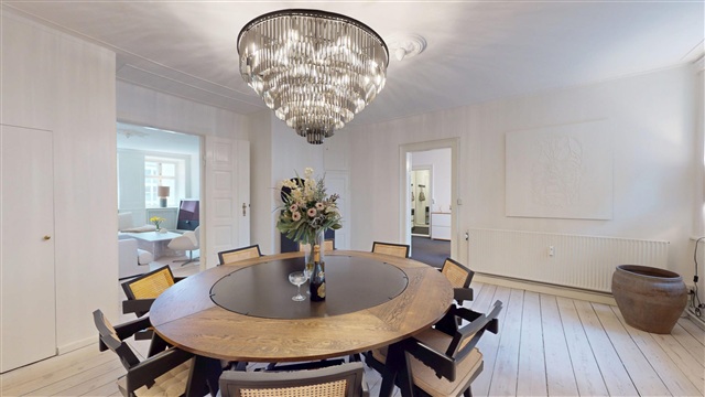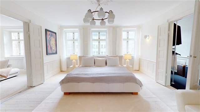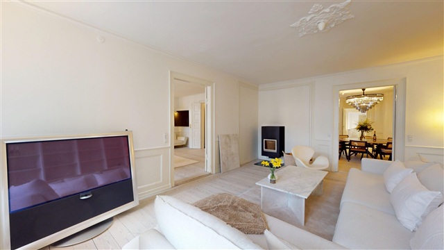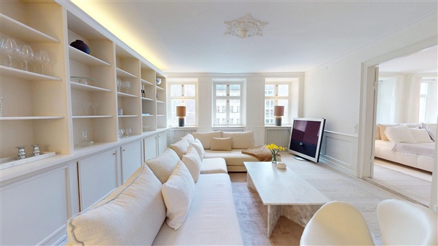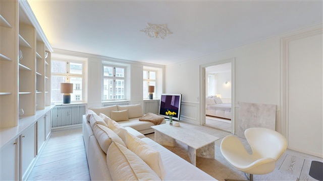 Ved ankomsten mærkes straks lejlighedens unikke atmosfære, hvor tidløs elegance smelter sammen med nutidens bekvemmeligheder i en gennemført og stilren indretning. Boligen fremstår lys og inviterende med velafmålte rum og fine detaljer, som fremhæver den historiske charme, ejendommen besidder.Lejlighedens centrale punkt er det imponerende master bedroom, som udstråler både fredfyldthed og luksus. Udover et stort soveværelse tilbydes et rummeligt walk-in closet, udført med både funktionalitet og æstetik for øje - en sjældenhed i denne type bolig. Den store tv-stue fungerer som det ideelle sted til afslapning eller samvær og suppleres af en elegant pejs, der tilfører varme og stemning. Det generøse sofaarrangement skaber rammen om hyggelige aftener i et lyst og velafbalanceret rum, som kombinerer komfort med stil.