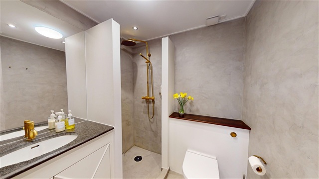 For enden af lejligheden findes et separat gæsteværelse, der med fordel kan fungere som privat område for besøgende, hjemmekontor eller ekstra opholdssted, alt efter behov. En ekstra fordel ved boligen er den medfølgende private parkeringsplads, hvilket i denne del af byen udgør en sjælden luksus og stor daglig praktisk fordel.