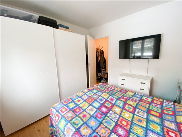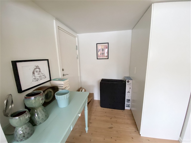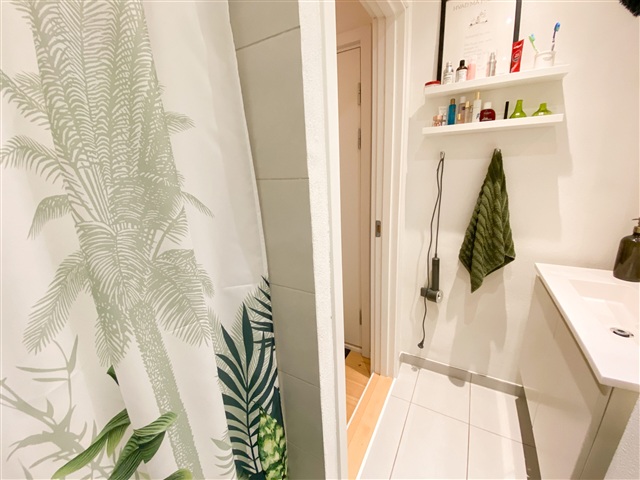 Denne indbydende lejlighed forener moderne faciliteter med en hyggelig atmosfære. Ved indtræden møder du en fordelingsgang, der fører til boligens forskellige rum. For enden ligger et behageligt soveværelse med udsigt til et fredeligt havemiljø. Her er et rummeligt og stilfuldt klædeskab, som sikrer rigeligt med opbevaringsplads.Badeværelset er totalrenoveret og præsenterer sig lyst og tidløst med hvide og lysegrå fliser. En indbygget bruseniche skaber et enkelt og afdæmpet udtryk, mens den store håndvask med tilhørende bordplads kombinerer funktionalitet og æstetik på fremragende vis.
