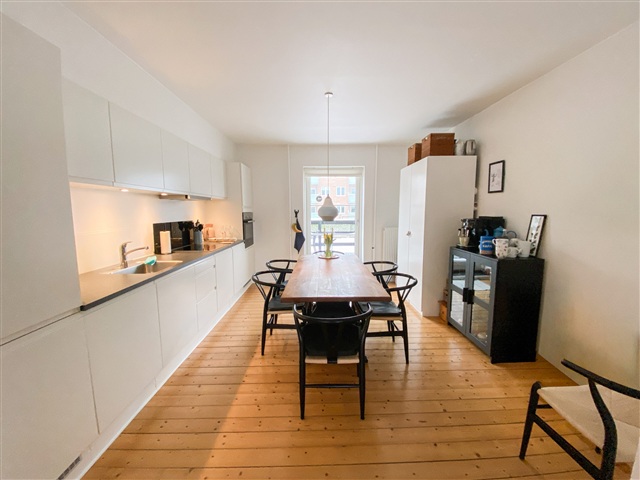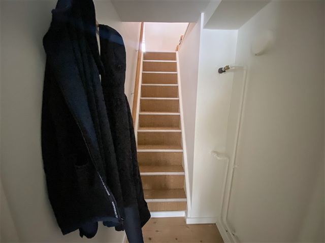 Til højre for entréen åbner lejligheden op til et lyst og rummeligt opholdsrum med adgang til en privat altan, hvor udelivet kan nydes. I den modsatte ende finder du et køkkenalrum, der er udstyret med hvide elementer og komplet hårde hvidevarer, herunder både opvaskemaskine og vaskemaskine. Køkkenets funktionelle og elegante indretning giver god plads til et større spisebord, hvilket gør det velegnet til samvær omkring måltider med familie og venner. Fra stuen fører en trappe ned til et ekstra værelse, som kan anvendes som soveværelse eller kontor. Rummet har god plads til en dobbeltseng, skrivebord og lignende møbler.