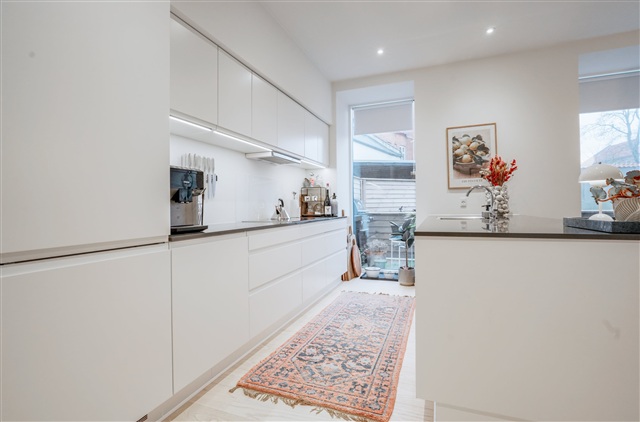 I en nyligt totalt renoveret ejendom udbydes denne attraktive treværelses lejlighed til leje. Boligen indeholder en rummelig stue, der er sammenhængende med køkken og spisestue, samt to separate soveværelser. Fra stuen er der direkte adgang til en privat altan via store skydedøre. Lejligheden er udført med eksklusive materialer såsom ægte trægulve, elegante fodlister, et badeværelse med klinker samt et lamelkøkken fra HTH udstyret med Siemens-hvidevarer.Lejligheden ligger i stueplan og har sin egen private indgang. Der er desuden mulighed for at leje en parkeringsplads i den tilhørende lukkede gård.