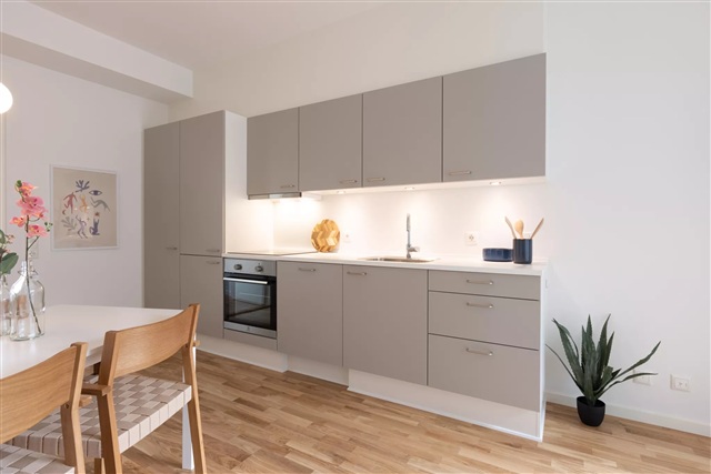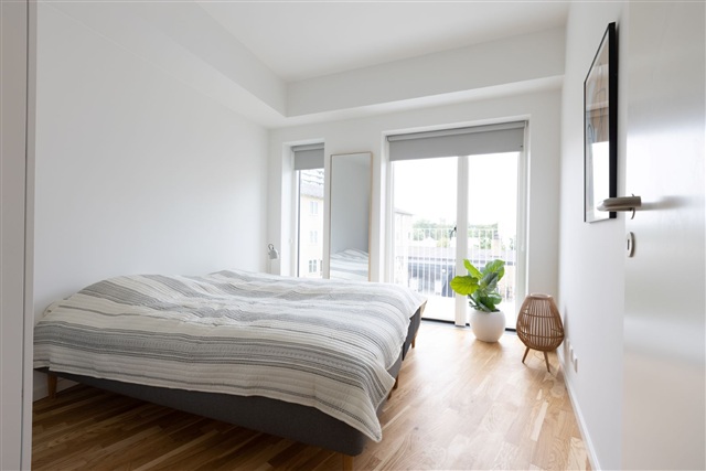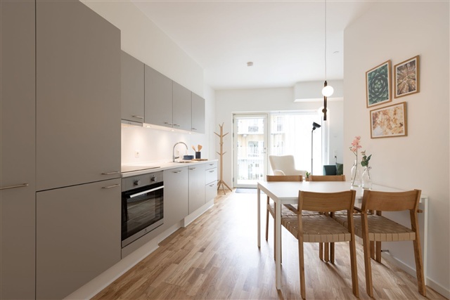 De treværelses lejligheder ligger i Colosseum, en ejendom opført i 2022, som befinder sig på Frederiksbjergs mest attraktive adresse. Ejendommen kan prale af syv fælles tagterrasser, der byder på en storslået udsigt over både byens skyline, vandet samt de omkringliggende naturområder. Desuden er der et markant gårdmiljø, som inkluderer grønne områder, hængekøjer samt et orangeri, hvilket tilføjer plads til både afslapning og sociale oplevelser.Indretningen består af et rummeligt køkkenalrum, hvor opvaskemaskine og køle-/fryseskab er integreret. Rummet rummer både spiseplads med bord og stole samt en stue, der kan indrettes med et behageligt sofaarrangement. To ens store soveværelser følger med, begge udstyret med egen altan, hvilket gør lejlighederne særdeles velegnede til samboerskab. Badeværelset er forsynet med bruseniche og har kombineret vaskemaskine og tørretumbler, som begge er inkluderet i boligens faciliteter.
