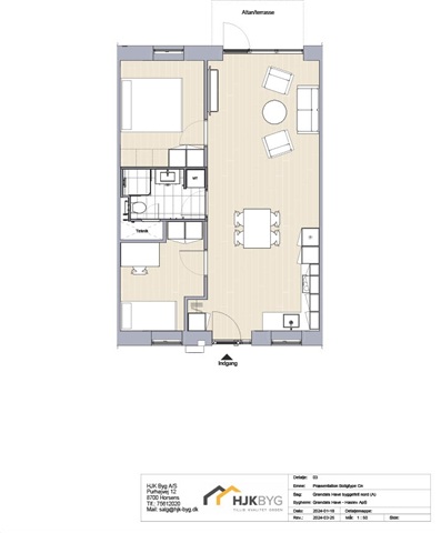 Lejligheden byder på tre værelser og en entré med plads til garderobe. Herfra åbner boligen op til et lyst køkken-alrum og stue i ét samlet rum, hvor det praktiske hjørnekøkken skaber rig mulighed for både et spiseområde og en hyggelig siddeplads. Fra stuen er der adgang til en stor altan, der vender mod sydvest, hvilket sikrer sollys fra eftermiddag til aften. De to værelser er rummelige og har indbyggede skabe, mens badeværelset fremstår moderne med materialer i samme stil som resten af lejligheden.Boligen er udstyret med gulvvarme, et ventilationsanlæg samt en høj isoleringsstandard, hvilket gør den både behagelig at opholde sig i og energieffektiv. Som en del af Grøndals Gård får du adgang til et stort, grønt gårdmiljø, der indeholder hyggelige stier og flere opholdsområder, der inviterer til fælles aktiviteter og udeliv. Desuden findes et fælles orangeri, som er rummeligt og velegnet til både spisning, samvær, brætspil eller uformelle møder med naboerne.