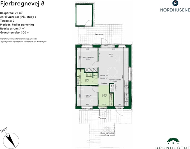 Udendørsområdet er oplagt til at nyde privatlivet med hele to terrasser samt en have, der vender mod et roligt og grønt område. Desuden er der tilknyttet et redskabsrum og gode faciliteter til cykelparkering, ligesom fælles parkeringspladser er til rådighed, hvilket sikrer en bekvem hverdag.