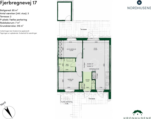 Udendørs er der to terrasser med forskellig orientering; den ene vender mod øst og den anden mod vest, hvilket giver mulighed for at følge solen hele dagen. Ydermere hører der til boligen et 7 m² stort redskabsrum, egen parkeringsplads samt cykelparkering umiddelbart ved indgangen. Dette hjem kombinerer lys, enkelhed og funktionalitet på en måde, der skaber en behagelig og indbydende atmosfære fra første øjeblik.