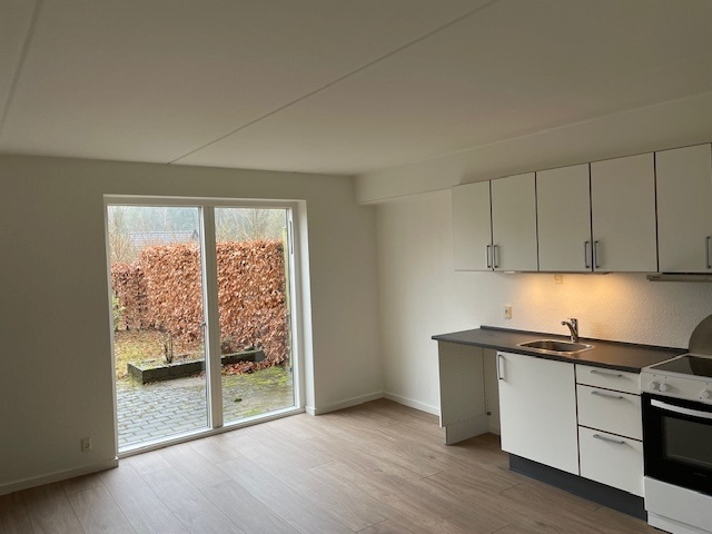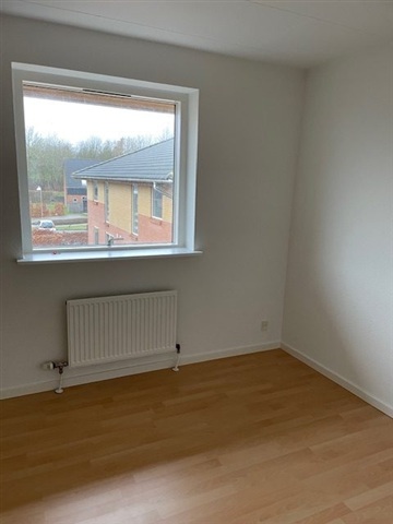 Dette rækkehus er fordelt over to etager og placeret i attraktive omgivelser med kun en kort afstand til Hammel centrum. Boligen byder på en entré, en lys og indbydende stue, der er i åben forbindelse med køkkenet, samt et badeværelse på stueplanet. På første sal findes to rummelige værelser og et stort soveværelse, alle udstyret med indbyggede garderobeskabe. Fotosne stammer fra en tilsvarende bolig.Udendørs er der en terrasse belagt med fliser samt en mindre have, og til huset hører desuden et skur med fast bund, som dog ikke er isoleret. Det er tilladt at holde mindre husdyr i boligen.