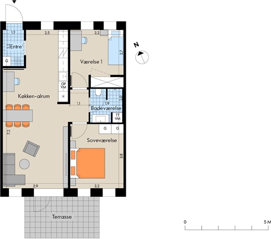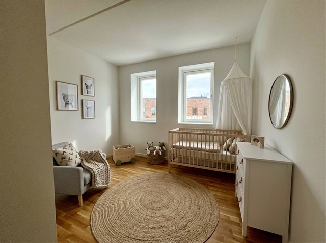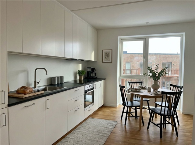 Køkken-alrummet er indrettet med en åben plan, hvilket sikrer god plads til både spisebord, sofaområde og en lille arbejdsplads, samtidig med at lysindfaldet fra to sider bidrager til en lys og luftig atmosfære. Terrassearealet vender mod sydvest, hvor du kan nyde solens stråler hen imod aften. Boligen byder på to værelser; det ene har indbyggede skabe, mens det andet passer perfekt som enten børneværelse eller kontor. Det store badeværelse er udstyret med en vaskesøjle, og lejligheden er holdt i neutrale, klassiske farvetoner, hvilket gør det nemt for dig at personliggøre hjemmet.Ejendommen er udstyret med elevator, og til boligen hører et depotrum i kælderen. Cyklen kan du parkere i et af de udendørs cykelområder, mens der er gode parkeringsmuligheder til bilen på området. Flere af parkeringspladserne har desuden fælles ladestandere til elbiler. Det skal bemærkes, at de viste billeder ikke er fra selve lejligheden, hvorfor udsigt, rum og lignende kan afvige. Billederne tjener derfor kun som illustration, og den faktiske størrelse og indretning fremgår af plantegningen. Møbleringen indendørs er AI-genereret, og billedet af badeværelset er en visualisering.