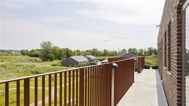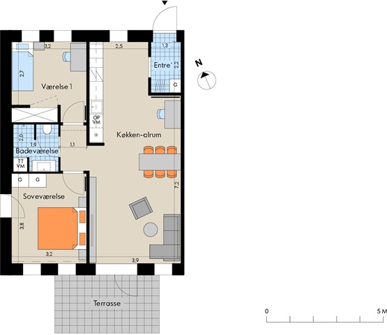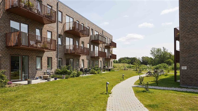 Køkken-alrummet er indrettet med en åben plan, hvilket gør det nemt at finde plads til både spiseområde, opholdsstue og et mindre arbejdsområde. Det naturlige lys trænger ind fra to sider og forstærker den luftige fornemmelse. Terrassen vender mod sydvest, hvor aftensolen kan nydes i ro og mag. Boligen rummer to værelser, hvoraf det ene er udstyret med indbyggede garderobeskabe, mens det andet værelse egner sig godt som børneværelse eller kontor. Det store badeværelse indeholder en vaskesøjle, der gør det praktisk at håndtere vasketøjet. Lejlighedens farvevalg er holdt i tidløse nuancer, hvilket giver gode muligheder for at sætte sit personlige præg.Ejendommen har elevator, og til boligen hører et depotrum placeret i kælderen. Til cykler er der opstillet dedikerede cykelområder udenfor, og bilerne kan parkeres bekvemt på de nærliggende parkeringspladser, hvor der også er flere fælles ladestandere til elbiler. Vær opmærksom på, at billederne, som vises, ikke stammer fra denne specifikke bolig, og at udsigt, rumstørrelser og indretning kan variere. De viste billeder fungerer derfor kun som illustration, hvor den endelige størrelse og ruminddeling fremgår af plantegningen, mens møbleringen på de indendørs fotos er AI-genereret, og badeværelsesbilledet er en visualisering.