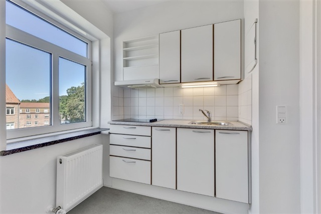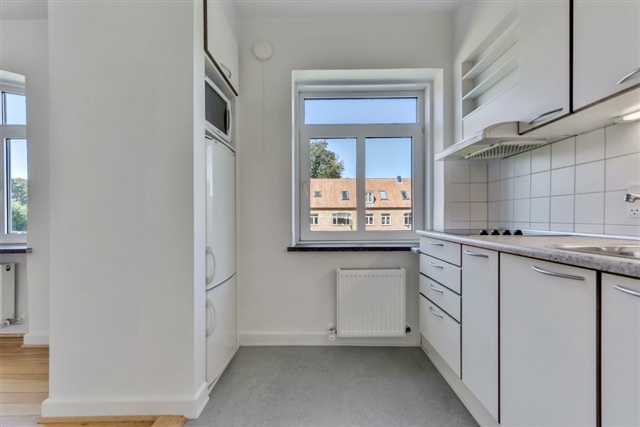 Denne lyse og indbydende lejlighed på 39 kvadratmeter er ideelt placeret i en charmerende ejendom, der forener byen og naturen på nærværende vis. Boligen er indrettet som en 1-værelses med en åben og funktionel indretning, der gør den velegnet til både singler og studerende, der søger et overskueligt og praktisk hjem.Lejlighedens centrale rum består af en rummelig opholdsstue med tilhørende alkove, hvor store vinduer sikrer godt med dagslys samt en fredelig udsigt til de omkringliggende grønne områder. Køkkenet fremstår moderne og fuldt udstyret med køle-/fryseskab, bordkomfur, mikroovn og emhætte, understøttet af central udsugning. Badeværelset er lyst og stilrent med fliser, og de afhøvlede, lakerede gulve samt energivinduer bidrager til en behagelig atmosfære.